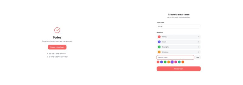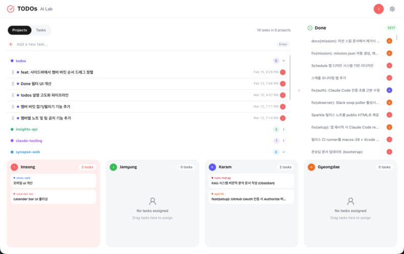 TODOs는 팀 내 업무를 함께 볼 수 있는 태스크 관리 툴입니다. AI Lab은 Jira를 쓰지 않았습니다. 팀이 작았고, 필요하지 않았습니다. 그런데 팀의 개발 속도가 빠르게 올라가면서 달라졌습니다. 누가 무엇을 하고 있는지 함께 볼 수 있는 것이 필요해졌습니다.