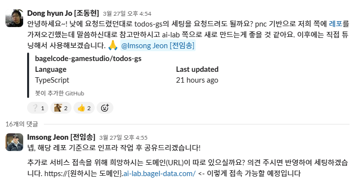 슬랙 채널에 TODOs 튜닝 세팅 요청하는 모습