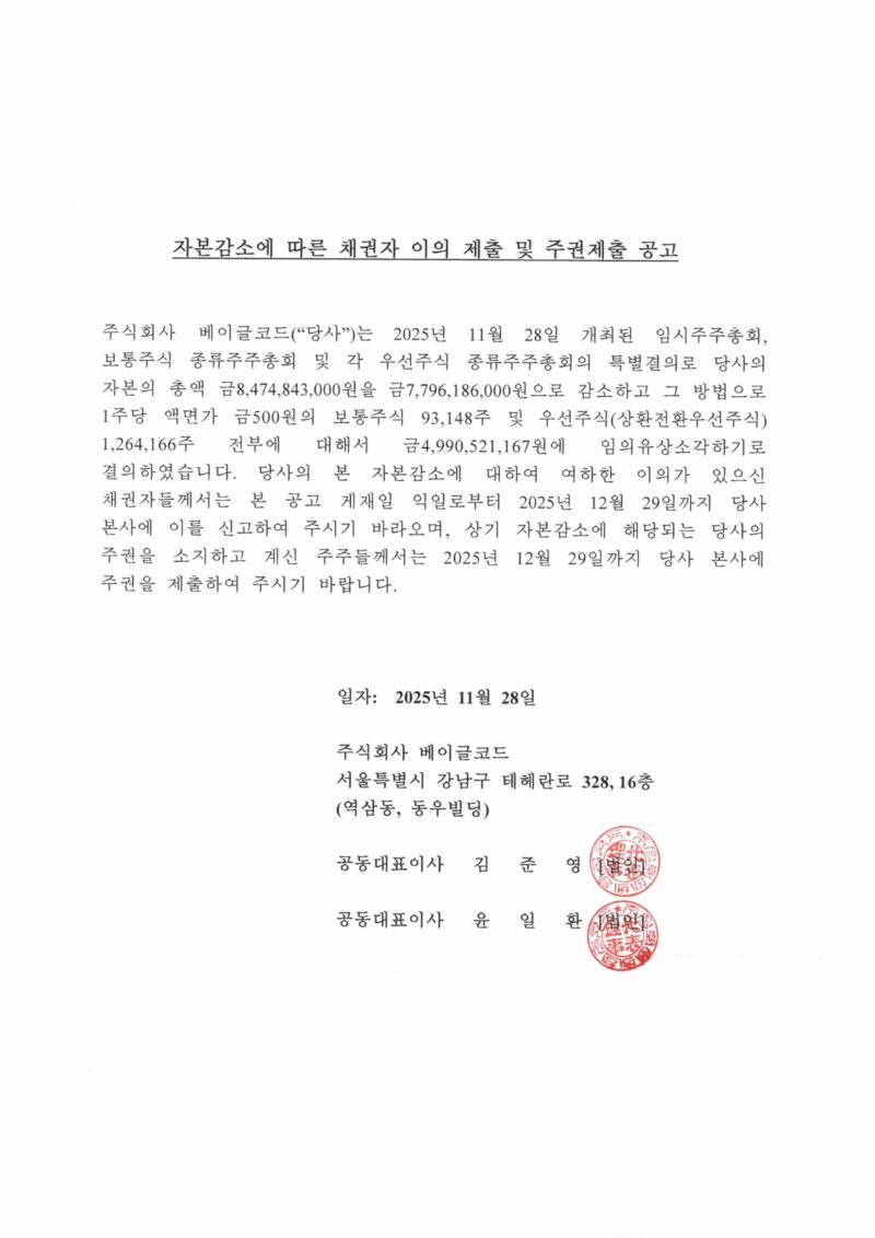 베이글코드_채권자 이의 제출 및 주권제출 공고_20251128